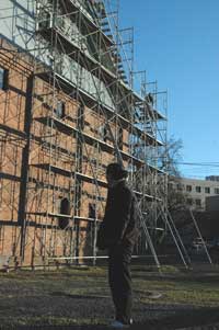 photo:屋根改修工事中の倉庫を見つめる豊嶋氏2004/12/09 吉井酒造煉瓦倉庫にて
