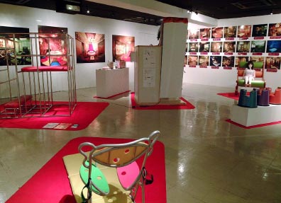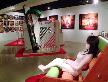 これ、都築響一さんの展覧会をやったんですけど、 「ラブホの夢は夜開く」、というのをやりまして、 都築さんともこの時をきっかけに お付き合いをさせていただいています。 都築さんはラブホテルの写真集も出してますけども、 結局、ああいうのを少数派って捉えるんじゃなくて 実際のところあっちがぜんぜん過半数超えてて、かっこいいデザインホテルとか言ってる人ってほんと数パーセントよ、って話を都築さんがよくされていたんです。 これはラブホテルのインテリアっていうのをインテリアデザイン的に 捉えてやろうとか、ラブホテルの家具とかをファニチャーデザインっていう カタカナでやろうとか、そういう大人のおもちゃっていうのをプロダクトデザインと呼んで展示しようっていうふうにしてやった展覧会です。 で、手前にいるのが上代75万円もするイヴちゃんと言う人形なんですけども、 こういうのも借りてきたりして…。 真中にいるのが回転クルクル、という名前の家具っていうか、ものなんですけど、 この縦になってるのがベッドみたいになってて、身体をこうマジックテープみたいので いろいろしばりつけてベッドでぐるぐる回る、ってそれだけのことなんですけど、(笑) 新潟県の方のメーカーからお借りしたりしまして…。 なんか家具の見本市、なんていう方法でやってみるというかんじでした。…。