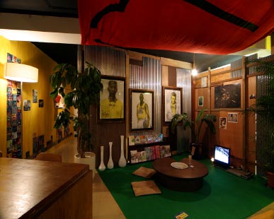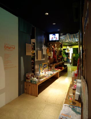 いつもはバーのところも、こう電飾がいっぱいついてて タイのバーみたいになったりとか、その横にあるのは、 都築さんが出店してくれたタイのレコードジャケットなんですけど、 七十年代のタイの歌謡曲のレコードジャケットとかがすごいいっぱいあったりとか。 この時はタイからも4人、アーティストが実際に来てくれて ワークショップやってくれたりとか、 タイではミスチル並に有名なモダンドッグっていうバンドがあるんですけど、 彼らが来てここでライブやってくれたりとか、 そういういろいろな展覧会以外のイベントっていうのも すごいいっぱいやりました。